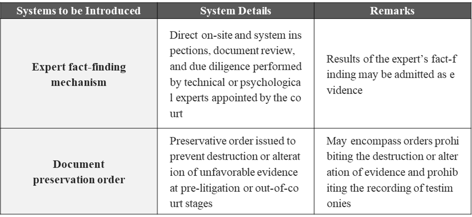 To mitigate information imbalance in technology disputes and to ease the evidentiary burden on affected companies, the MSS plans to introduce K-Discovery System. This can be interpreted as an attempt to introduce a system modeled on the U.S.-style discovery process—which requires the submission of documents and evidence at the request of the opposing party in litigation—in a manner tailored to local practices in Korea. The K-Discovery System is expected to include (i) an expert fact-finding mechanism under which court-appointed experts conduct on-site inspections in damages litigation related to technical data, patents, or trade secret infringement and submit their findings as admissible evidence; and (ii) a document preservation order system designed to prevent the destruction or alteration of unfavorable evidence at pre-litigation or out-of-court stages. Unlike the U.S.-style discovery process which requires parties to broadly disclose documents and evidence at the request of the opposing party, the Korean framework intends to pursue similar policy objectives while tailoring procedures to local practice.