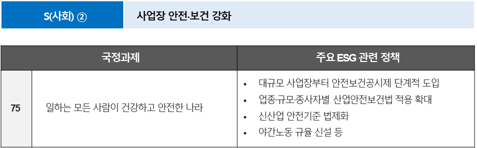 이재명 정부가 향후 5년간의 국정 운영방안을 국무회의를 통해 확정하고 지난 9월 16일에 발표했습니다. 이번에 발표된 국정 운영방안에는 ‘국민이 주인인 나라, 함께 행복한 대한민국’이라는 국가비전 아래 5대 국정목표, 23개 추진전략, 123개의 국정과제가 포함되었으며, 전체 123대 국정과제 중 27개(21.3%) 과제가 ESG 정책과 관련성이 있는 것으로 분석되었습니다. 1 본 이슈 브리핑에서는 이재명 정부 국정과제 중 ESG 관련 주요 과제들을 9개의 정책 테마로 분류하고, 각 테마별로 정책∙법제화 전망과 기업 영향을 살펴본 후 기업 대응방안을 제시하고자 합니다.