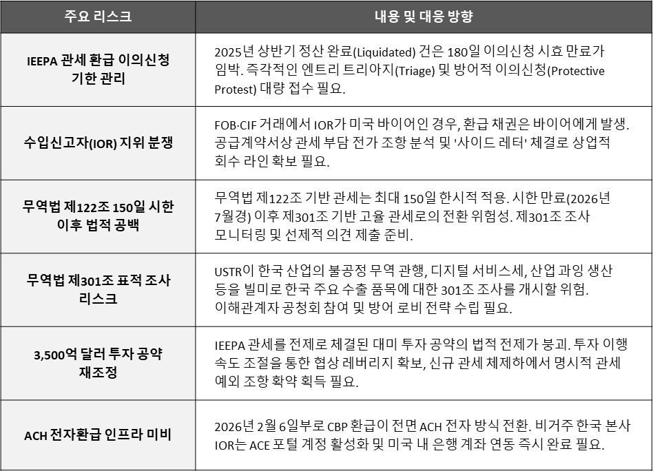 한국 기업들은 180일의 이의신청 기한 내에 IOR 증빙 데이터 확충, CIT소송제기, ACH 전자환급 계좌 등록 등을 통해 환급받을 권리를 행사해야 합니다. 지정학적 리스크와 관세 장벽의 '변동성 자체가 유일한 상수가 된' 새로운 글로벌 통상 환경 속에서, 전사적 통상 TF를 구축하고 공급망 원산지 관리와 유연한 계약 구조를 체질화하는 법적 회복탄력성(Legal Resilience)을 확보하는 것만이 유일한 생존 해법입니다.