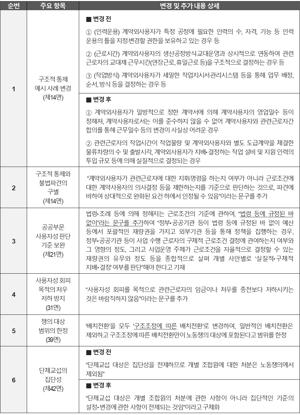 최종 확정된 개정 노동조합법 시행령은 2026. 1. 21.자 재입법예고안과 비교하여 일부 표현만 정비되었을 뿐 실질적인 내용 변화는 없습니다. 예컨대 제14조의11 제3항 제2호의 “계약형태·방식, 직종, 채용방법, 정년, 인사교류 여부 등에 따른 고용형태”가 “계약의 형태·방식, 직종, 채용방법, 정년, 인사교류 여부등을 고려한 고용형태”로 수정되는 등 문언이 다듬어진 수준에 그쳤습니다.