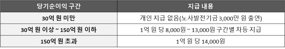 L사는 1994년 노사합의를 통해 당기순이익을 조건으로 하는 경영성과급 제도를 도입하였습니다. 당기순이익이란 수익에서 지출을 공제한 순이익을 말하는데, 2016년 단체협약에서는 당기순이익 규모에 따른 구간별 지급 기준을 다음과 같이 명시하였습니다. 이에 따라 2016년도 성과급으로 근로자 1인당 1,590,000원이 지급되었습니다.