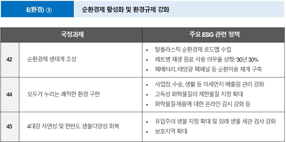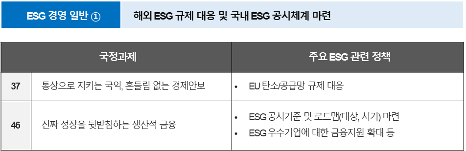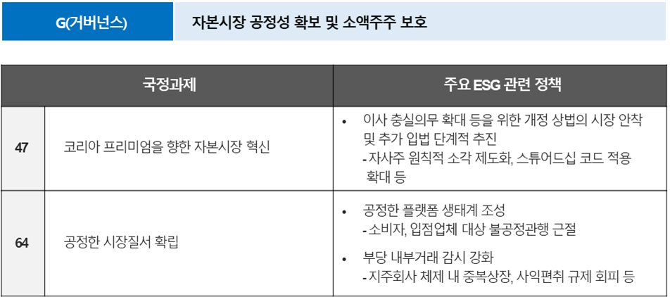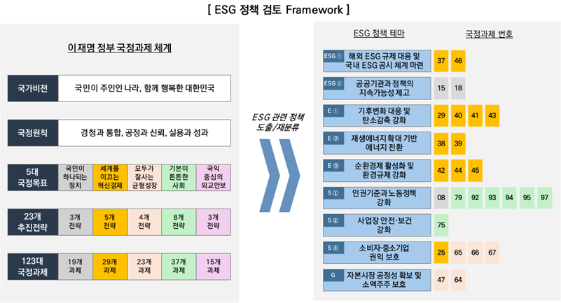 이재명 정부가 향후 5년간의 국정 운영방안을 국무회의를 통해 확정하고 지난 9월 16일에 발표했습니다. 이번에 발표된 국정 운영방안에는 ‘국민이 주인인 나라, 함께 행복한 대한민국’이라는 국가비전 아래 5대 국정목표, 23개 추진전략, 123개의 국정과제가 포함되었으며, 전체 123대 국정과제 중 27개(21.3%) 과제가 ESG 정책과 관련성이 있는 것으로 분석되었습니다. 1 본 이슈 브리핑에서는 이재명 정부 국정과제 중 ESG 관련 주요 과제들을 9개의 정책 테마로 분류하고, 각 테마별로 정책∙법제화 전망과 기업 영향을 살펴본 후 기업 대응방안을 제시하고자 합니다.