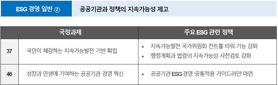 제5차 지속가능발전 국가기본전략(2026년~2045년)이 연내에 확정될 예정입니다. 이 기본전략에는 공공기관의 ESG 경영 가이드라인 등 지속가능성을 원칙으로 하는 공공기관 운영 방안이 포함될 것으로 보이며 그동안 각 기관에서 자율적으로 적용한ESG 경영이 의무로 전환될 가능성이 높습니다. 또한, 정부 정책 전반에 환경∙경제∙사회 영향 평가 등 지속가능성 평가체계가 구축되고 ESG 경영이 각 공공기관에 내재화될 가능성이 있습니다.