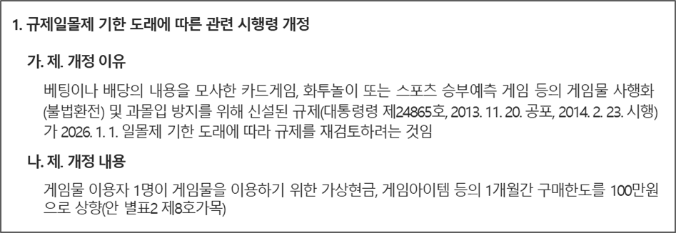 이번 개정안은 이른바 규제 대상 게임의 결제한도 완화에 초점이 맞춰져 있습니다. 구체적으로 현행 결제한도 70만원을 100만원으로 상향 조정하는 것이 이번 시행령 개정의 핵심 내용입니다.