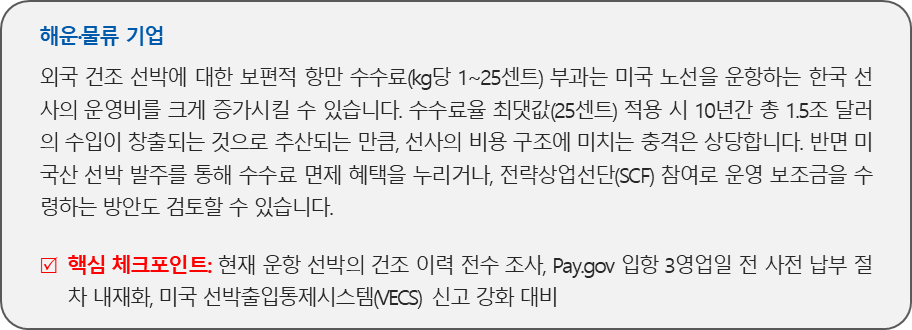 • 보편적 항만 수수료 : 외국 건조 선박의 미국 입항 시 화물 중량 기준 kg당 1~25센트 부과