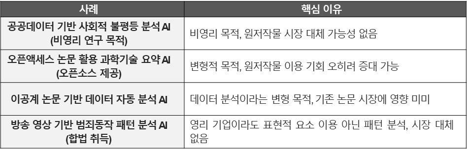 • 유리한 경우: 학습에 이용된 저작물과 무관한 목적 또는 성격의 결과물을 생성하는 AI 모델, 학습된 저작물과 동일·유사한 결과물 생성을 기술적으로 차단하는 조치를 갖춘 경우