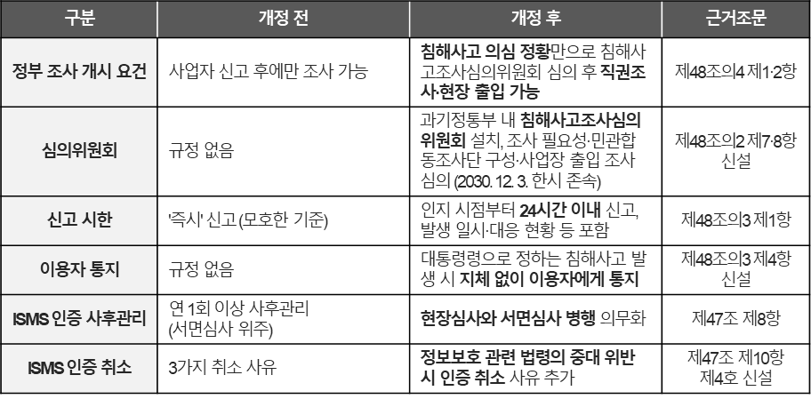 기존 정보통신망법 체계에서는 정보통신서비스 제공자가 침해사고를 자발적으로 신고하지 않는 한 과기정통부나 한국인터넷진흥원(KISA)이 조사에 착수할 수 있는 법적 근거가 없었습니다. 이 구조적 공백은 기업의 사고 은폐·신고 지연을 가능하게 하였고, 정부 대응이 늦어져 이용자 피해가 확산되는 문제가 반복되었습니다.
